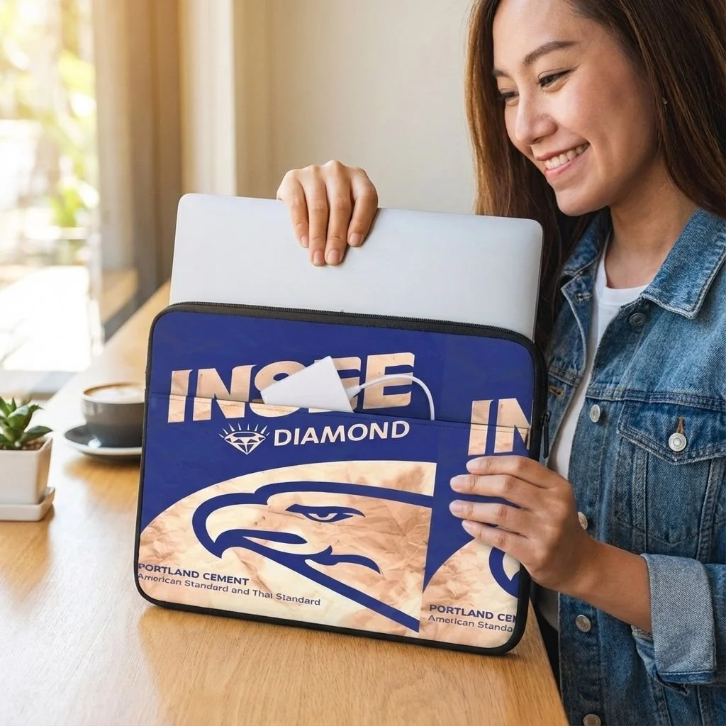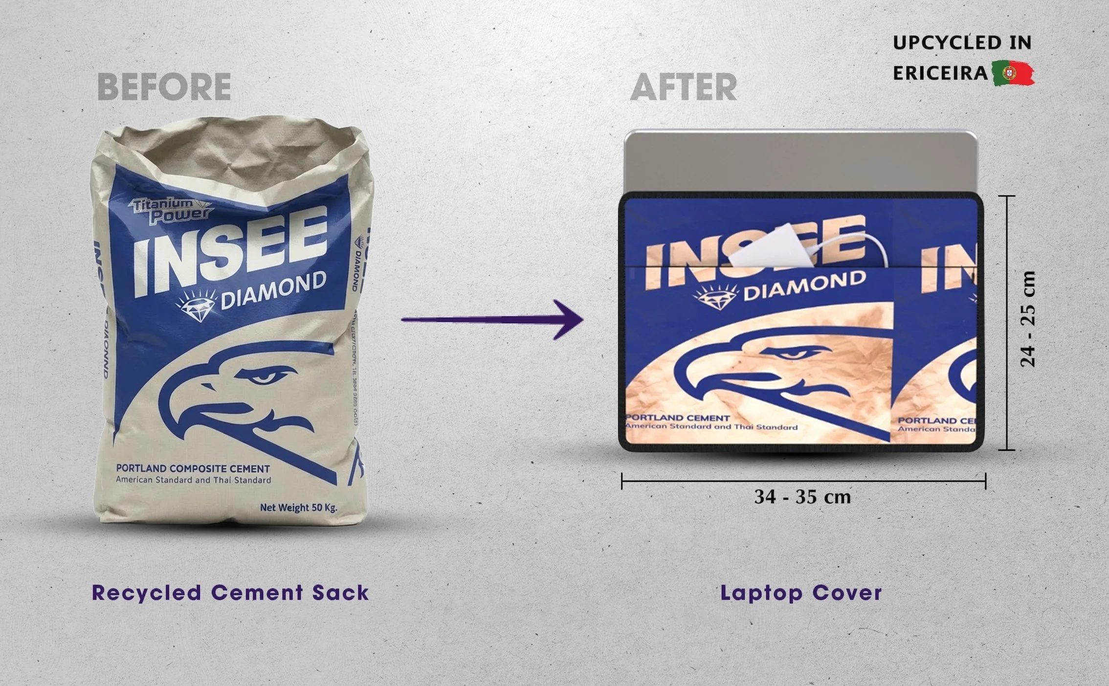 Capa para computador portátil, produzida na Ericeira, feita com sacos de cimento reciclados.